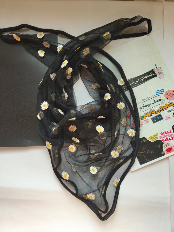 اگه دنبال یه اکسسوری متفاوت برای تکمیل استایلت هستی، این مینی اسکارف با پارچهی توری سبک و گلهای بابونهی گلدوزیشده یه انتخاب بینظیره 💫