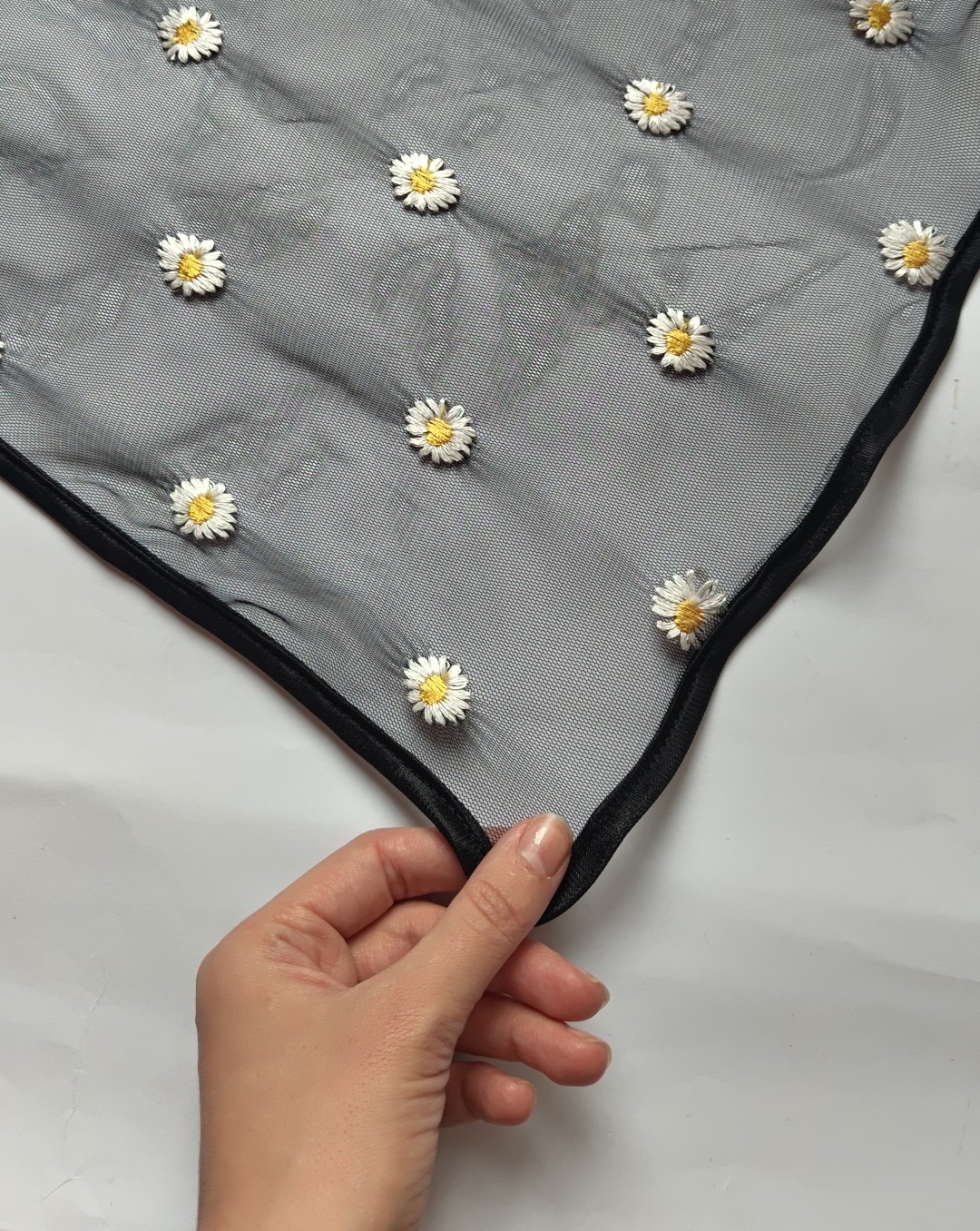 اگه دنبال یه اکسسوری متفاوت برای تکمیل استایلت هستی، این مینی اسکارف با پارچهی توری سبک و گلهای بابونهی گلدوزیشده یه انتخاب بینظیره 💫